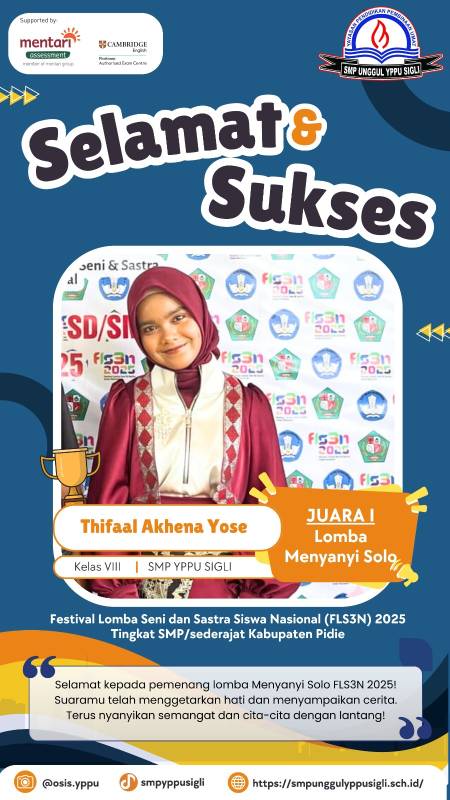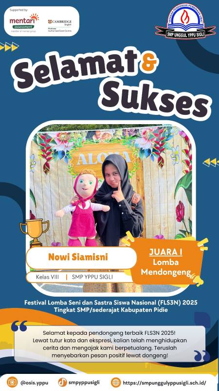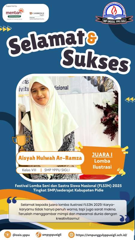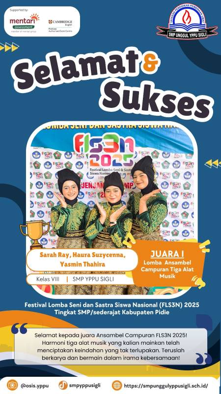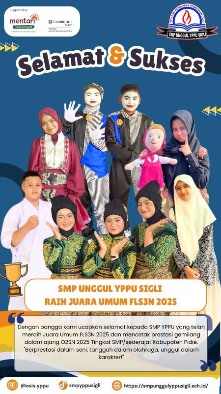 SIGLI, 24 Juni 2025 — SMP YPPU Sigli sukses meraih predikat Juara Umum dalam ajang Festival Lomba Seni dan Sastra Siswa Nasional (FLS3N) tingkat Kabupaten Pidie yang diselenggarakan oleh Dinas Pendidikan dan Kebudayaan Kabupaten Pidie, bertempat di Aula SMA/SMP Negeri Unggul Sigli, hari ini.Pada ajang bergengsi ini, SMP YPPU Sigli tampil gemilang dengan menyabet lima juara pertama dari berbagai bidang lomba, yaitu:· Juara 1 Vokal Solo· Juara 1 Pantomim· Juara 1 Ilustrasi· Juara 1 Ansambel Musik· Juara 1 MendongengKepala SMP YPPU Sigli, Drs. H. Armiya, mengungkapkan apresiasi dan rasa bangga atas kerja keras para peserta dan pelatih yang telah mempersiapkan lomba dengan maksimal. “Ini adalah bukti bahwa bakat dan kerja keras para siswa dan para guru pembimbing hingga dapat membawa sekolah mengukir prestasi di tingkat daerah, apresiasi untuk semua warga YPPU” ujarnya.Kepala Dinas Pendidikan dan Kebudayaan Kabupaten Pidie, Drs. Yusmadi, juga memberikan ucapan selamat kepada SMP YPPU Sigli atas keberhasilan yang dicapai. Ia berharap prestasi ini dapat memotivasi sekolah-sekolah lainnya untuk terus mengembangkan bakat dan minat siswa dalam bidang seni dan sastra.Ajang FLS2N ini sendiri merupakan agenda tahunan yang bertujuan untuk mengasah kemampuan seni dan literasi peserta didik, sekaligus menjaring bibit-bibit unggul yang dapat mewakili daerah ke tingkat provinsi maupun nasional.