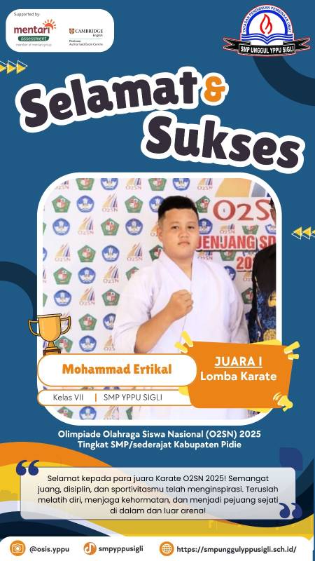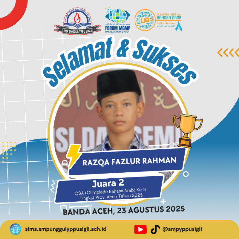 Banda Aceh, 23 Agustus 2025 – Kabar gembira datang dari ajang Olimpiade Bahasa Arab (OBA) Tingkat Provinsi Aceh. Siswa SMP YPPU, Razqa Fazlur Rahman, berhasil meraih Juara 2 pada kategori SMP Negeri/Swasta Non Boarding.Perlombaan yang digelar di Banda Aceh pada tanggal 23 Agustus 2025 tersebut diikuti oleh ratusan peserta dari berbagai sekolah se-Aceh. Dalam kompetisi ini, peserta diuji dalam berbagai aspek kemampuan bahasa Arab, mulai dari tata bahasa, pemahaman bacaan, hingga keterampilan berbicara.Dengan persaingan yang sangat ketat, Razqa tampil gemilang dan mampu membuktikan kemampuannya, sehingga berhasil mengharumkan nama sekolah di tingkat provinsi.Kepala SMP YPPU menyampaikan apresiasi yang tinggi atas prestasi tersebut. “Alhamdulillah, kami sangat bangga dengan pencapaian Razqa. Prestasi ini menjadi bukti nyata kerja keras siswa, dukungan guru terutama Pak Supriadi, S.Pd guru sebagai Bahasa Arab, serta doa dari seluruh keluarga besar SMP YPPU. Semoga ini menjadi motivasi bagi siswa lain untuk terus berprestasi di berbagai bidang,” ungkapnya.Sementara itu, Razqa Fazlur Rahman menyatakan rasa syukur dan bangganya. Ia bertekad untuk terus meningkatkan kemampuan bahasa Arab dan siap menghadapi tantangan kompetisi berikutnya.Prestasi ini semakin memperkuat komitmen SMP YPPU dalam melahirkan generasi muda yang cerdas, berdaya saing, serta berkarakter Islami.SMP YPPU Sigli Raih Gelar Juara Umum FLS3N Se-Kabupaten Pidie